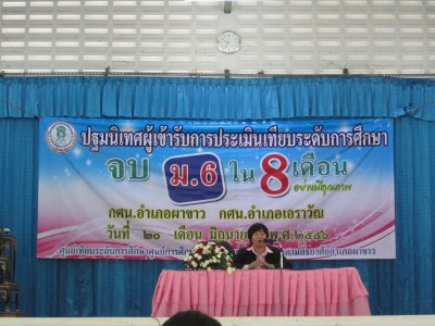 กศน.อำเภอผาขาว นำโดยท่าน สังวาล สุวรรณโสภา ผู้อำนวยการศูนย์การศึกษานอกระบบและการศึกษาตามอัธยาศัยอำเภอผาขาว จัดกิจกรรมปฐมนิเทศใน โครงการยกระดับการศึกษา จบ ม.๖ ใน ๘ เดือน ให้กับผู้สมัครเข้าเรียนในโครงการยกระดับทางการศึกษา ในวัน พฤหัสบดี ที่ ๒๐ มิถุนายน พ.ศ. ๒๕๕๖ ณ ห้องประชุมอำเภอผาขาว โดยกิจกรรมผู้เข้าร่วมรับฟังปฐมนิเทศครั้งนี้ ก็ได้รับทราบนโยบายและแนวทางในการดำเนินการที่จะเรียน ม๖ ภายใน ๘ เดือน ในครั้งนี้เป็นอย่างดีด้วย