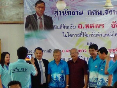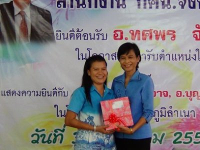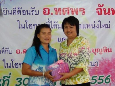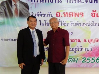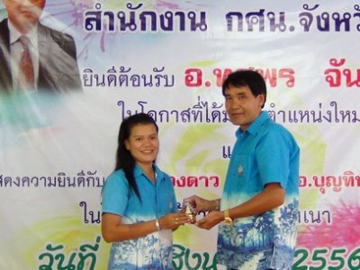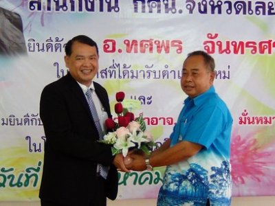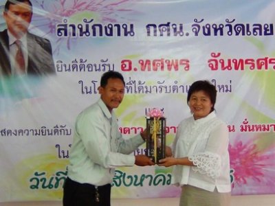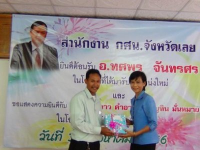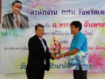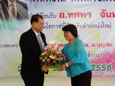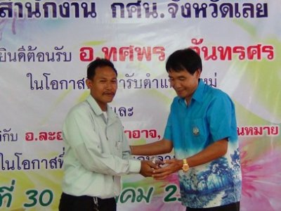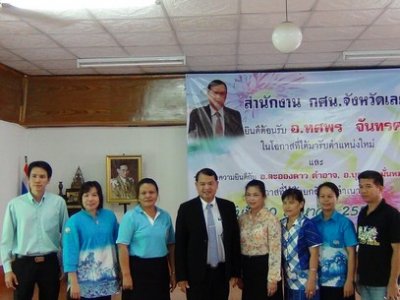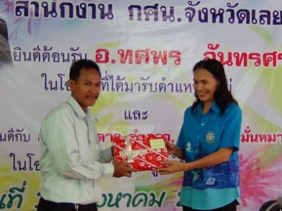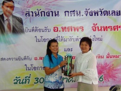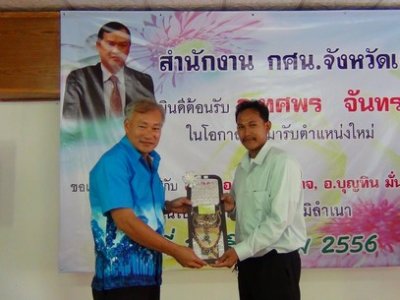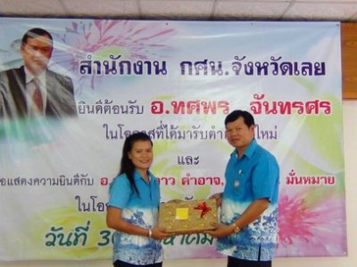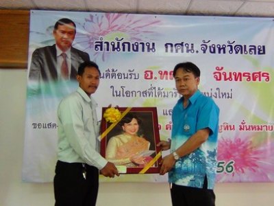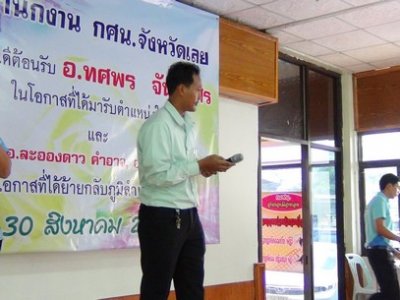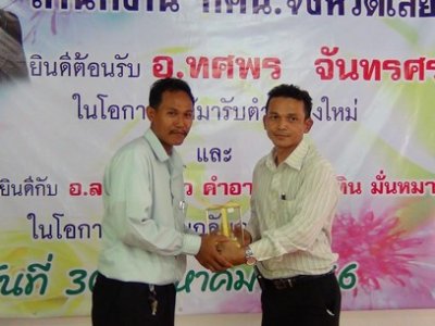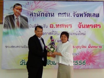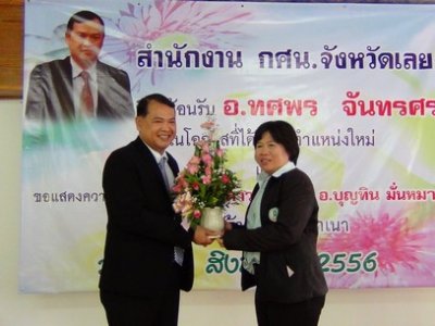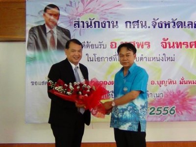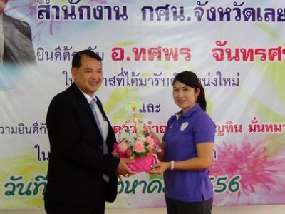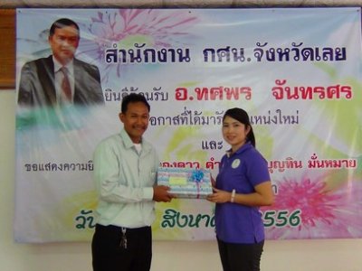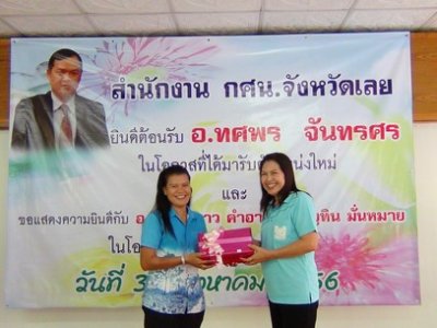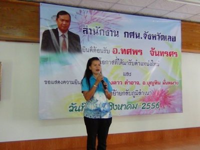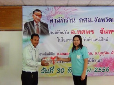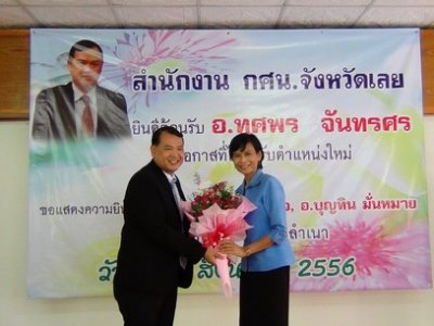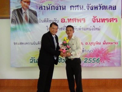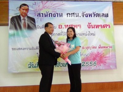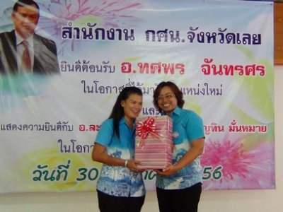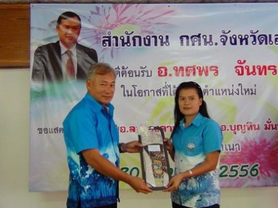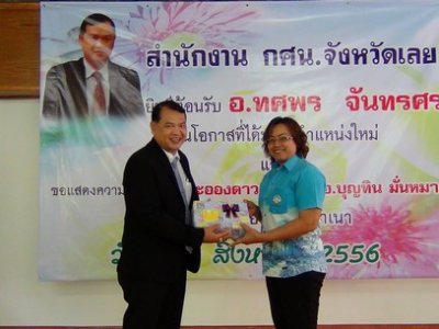 เมื่อวันที่ ๓๐ สิงหาคม ๒๕๕๖ สำนักงาน กศน.จังหวัดเลย ต้อนรับ นายทศพร จันทรศร จากสำนักงานพระพุทธศาสนา จังหวัดเลย ย้ายมาดำรงตำแหน่ง นักจัดการงานทั่วไปชำนาญการ กลุ่มอำนวยการ สำนักงาน กศน.จังหวัดเลย และสำนักงาน กศน.จังหวัดเลย ได้แสดงความยินดีกับอาจารย์ละอองดาว คำอาจ ครู กศน.อำเภอภูหลวง ที่ได้ย้ายกลับไปทำงานประจำภูมิลำเนา อำเภอโพนพิสัย จังหวัดหนองคาย และนายบุญทิน มั่นหมาย ครู กศน.อำเภอเชียงคาน ที่ได้ย้ายกลับไปทำงานประจำภูมิลำเนา อำเภอเจริญศิลป์ จังหวัดสกลนคร โดยมี ว่าที่ พ.ต. สุรพล ประเสริฐธรรม รองผู้อำนวยการสำนักงาน กศน.จังหวัดเลย ให้เกียรติเป็นประธานกล่าวเปิดงานอวยพร พร้อมคณะผู้บริหาร และบุคลากรครู มอบของที่ระลึก ณ ห้องประชุมคุรุสัมนาคาร กศน.อำเภอเมืองเลย