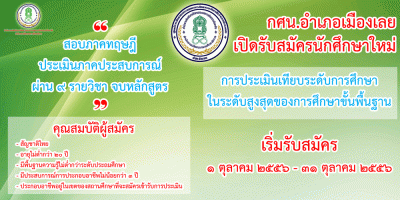 กศน.อำเภอเมืองเลย จังหวัดเลย เปิดรับสมัครนักศึกษาใหม่ !! "การประเมินเทียบระดับการศึกษาในระดับสูงสุดของการศึกษาขั้นพื้นฐาน" ตั้งแต่วันที่ ๑ ตุลาคม ๒๕๕๖ - ๓๑ ตุลาคม ๒๕๕๖