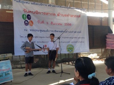 กศน.ตำบลท่าสวรรค์ ร่วมกิจกรรม "วันคนพิการสากล" ในวันที่ ๓ ธันวาคม ๒๕๕๖ ณ หอประชุมองค์การบริหารส่วนตำบลท่าสวรรค์ โดยอาสาพัฒนาผู้พิการชุมชน ร่วมกับ อสม.ท่าสวรรค์ อบต.ท่าสวรรค์ มูลนิธิธิดาเมตตาธรรม รพ.สต.ท่าสวรรค์ หน่วยพัฒนาการเคลื่อนที่ ๒๓ ร.ร.บ้านท่าสวรรค์ และประชาชนในตำบล กิจกรรมครั้งนี้ นำโดยนายปฏิภาณ สุวรรณชาติ หัวหน้าโซนนาสวรรค์ พร้อมครู กศน.ตำบลท่าสวรรค์ และบรรณารักษ์ ได้ให้บริการหนังสือหลากหลายประเภท รวมถึงการจัดมุมอาเซียน เพื่อเป็นการส่งเสริมการอ่านให้กับผู้พิการในชุมชน และประชาชนทั่วไปในตำบลท่าสวรรค์