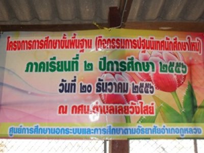 กศน.อำเภอภูหลวง จัดกิจกรรมด้านการศึกษาขั้นพื้นฐาน โดย นางสมใจ สายมา ผู้อำนวยการศูนย์การศึกษานอกระบบและการศึกษาตามอัธยาศัยอำเภอภูหลวง เป็นประธานพิธีเปิด กิจกรรมปฐมนิเทศนักศึกษาใหม่ ภาคเรียนที่ ๒ ปีการศึกษา ๒๕๕๖ ณ กศน.ตำบลเลยวังไสย์ ในวันที่ ๒๐ ธันวาคม ๒๕๕๖ เพื่อเป็นการแนะแนวชี้แจง ร่วมกำหนดแนวทางการจัดกระบวนการเรียนการสอนร่วมกันระหว่างองค์กรนักศึกษา คณะกรรมการสถานศึกษาระดับตำบล ผู้ปกครอง และนักศึกษา พร้อมทั้งให้ความรู้แก่นักเรียน