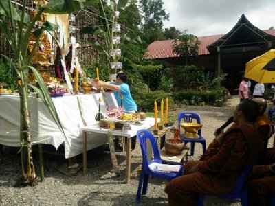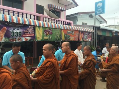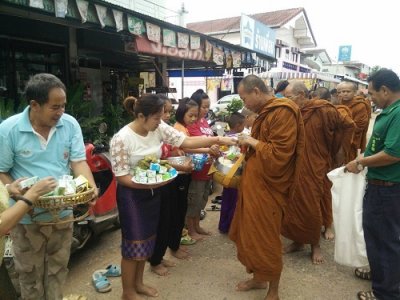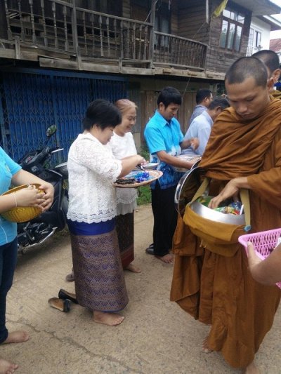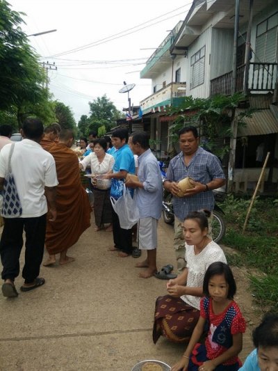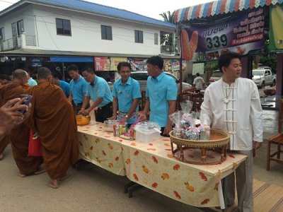 โดยในช่วงเช้าของวันที่ ๑๒ สิงหาคม ๒๕๕๘ เวลา ๐๖:๓๐ น. ได้ร่วมทำบุญตักบาตรพระภิกษุสงฆ์ ที่ถนนหน้าโรงเรียนโนนปอแดงร่วมกับท่านธนภัทร