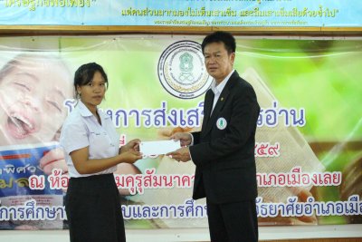 เมื่อวันที่ ๑๐ สิงหาคม ๒๕๕๙ นายสุพัฒน์ สุวรรณสิงห์ ผอ.กศน.อำเภอเมืองเลย เป็นประธานกล่าวเปิดอบรมโครงการส่งเสริมการอ่าน ประจำปี ๒๕๕๙ โดยมีคณะบุคลากร กศน.อำเภอเมืองเลย ร่วมกันจัดกิจกรรมให้กับนักศึกษา กศน. ทั้ง ๑๔ ตำบล ได้แก่การประกวดการร้องเพลงเกี่ยวกับวันแม่, การประกวดอ่านบทร้อยแก้ว, การประกวดคัดไทยหัวข้อแม่ และการประกวดเขียนเรียงความเรื่องแม่ ณ ห้องประชุมคุรุสัมนาคาร กศน.อำเภอเมืองเลย จังหวัดเลย