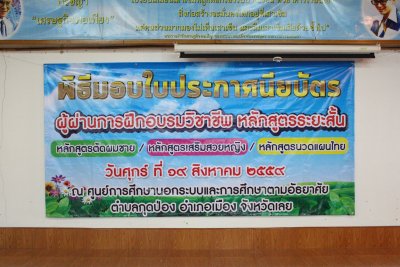 เมื่อวันที่ ๑๙ สิงหาคม ๒๕๕๙ นายสุพัฒน์ สุวรรณสิงห์ ผอ.กศน.อำเภอเมืองเลย เป็นประธานพิธีมอบวุฒิบัตรผู้ผ่านการอบรมหลักสูตรระยะสั้นช่างตัดผมชาย ๕๐ ชั่วโมง ๑๘ คน หลักสูตรระยะสั้นช่างเสริมสวย ๕๐ ชั่วโมง ๑๖ คน และหลักสูตรระยะสั้นนวดแผนไทย ๑๐๐ ชั่วโมง ๒๒ คน ณ ห้องประชุมคุรุสัมนาคาร กศน.อำเภอเมืองเลย จังหวัดเลย