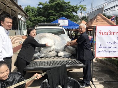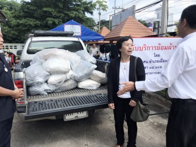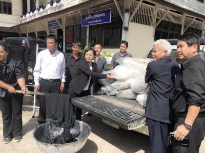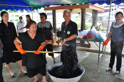 จากนั้นช่วงบ่ายคุณสุมลรัตน์ บรรจงเลี้ยง นำสีดำ Super Black จำนวน ๑๑ กระสอบ Anhydrous Sodium จำนวน ๘ กระสอบ และ Sodium Sulfide จำนวน ๔ กระสอบ เป็นมูลค่าแสนกว่าบาท นำมาบริจากให้กับ นายบุญโชค พลดาหาญ ผอ.กศน.จังหวัดเลย และนายสุพัฒน์ สุวรรณสิงห์ ผอ.กศน.อำเภอเมืองเลย เพื่อนำไปใช้ย้อมผ้าให้กับประชาชน ฟรี ณ กศน.จังหวัดเลย