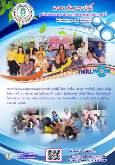 กศน.ตำบลโคกใหญ่ ดำเนินการจัดพัฒนาอาชีพระยะสั้น กลุ่มสนใจ (ไม่เกิน 30 ชั่วโมง ) หลักสูตร การทำไข่เค็ม จำนวน 22 ชั่วโมง จัดระหว่างวันที่ 15 -24 ธันวาคม 2563 โดยมีนายคุณากิจ แสงโสดา ผู้ใหญ่บ้านห้วยไค้ ให้เกียรติ เปิดโครง ฯ วิทยากรให้ความรู้ โดยนางวิลัยวัลย์ โสภาวัฒน์ กลุ่มเป้าหมายเป็นประชาชน จำนวน 15 คน สถานที่จัด ณ บ้านห้วยไค้ หมู่ที่ 4 ตำบลโคกใหญ่ อำเภอท่าลี่ จังหวัดเลย