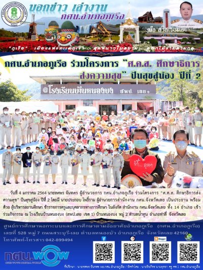วันที่ 4 มกราคม 2564 นายทศพร จันทศร ผู้อำนวยการ กศน.อำเภอภูเรือ ร่วมโครงการ “ศ.ค.ส. ศึกษาธิการส่งความสุข” ปันสุขสู่น้อง ปีที่ 2 โดยมี นายประกอบ โพธิ์ราม ผู้อำนวยการสำนักงาน กศน.จังหวัดเลย เป็นประธาน พร้อมด้วย ผู้บริหารสถานศึกษา ข้าราชการครูและบุคลากรทางการศึกษา ในสังกัด สำนักงาน กศน.จังหวัดเลย ทั้ง 14 อำเภอ เข้าร่วมกิจกรรม ณ โรงเรียนบ้านหนองบง (สพป.เลย เขต 1) บ้านหนองบง หมู่ 2 ตำบลน้ำทูน อำเภอท่าลี่ จังหวัดเลย