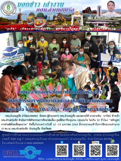 กศน.อำเภอภูเรือ นำโดย นายทศพร จันทศร ผู้อำนวยการ กศน.อำเภอภูเรือ มอบหมายให้ นางสายพิน จารัตน์ หัวหน้า กศน.ตำบลร่องจิก ดำเนินการจัดกิจกรรมการศึกษาต่อเนื่อง ศูนย์ฝึกอาชีพชุมชน กลุ่มสนใจ ไม่เกิน 30 ชั่วโมง “หลักสูตรการทำสลัดโรลเพื่อสุขภาพ” จัดขึ้นในระหว่างวันที่ 12 –15 มกราคม 2564 มีประชาชนเข้ารับการฝึกอบรมจำนวน 10 คน ณ กศน.ตำบลร่องจิก อำเภอภูเรือ จังหวัดเลย