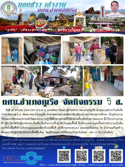 วันที่ 18 มกราคม 2564 เวลา 15.00 น. นายทศพร จันทศร ผู้อำนวยการ กศน.อำเภอภูเรือ นำคณะบุคลากรในสังกัด ร่วมทำกิจกรรม 5 ส. พัฒนา กศน.อำเภอภูเรือ ทำความสะอาด และจัดระเบียบห้องเก็บของของสถานศึกษา เป็นเกิจกรรมให้บุคลากรที่ทุกคนสามารถเข้าใจแนวทางการปฏิบัติได้ง่าย อุปกรณ์ที่ใช้มีเพียงเครื่องมือทำความสะอาด ซึ่งใช้งบประมาณต่ำ ผู้ทำ 5ส ได้เรียนรู้การทำงานเป็นทีมเป็นกิจกรรมที่ปฏิบัติเป็นกลุ่มพื้นที่ ซึ่งมีส่วนสนับสนุนเรื่องการทำงานเป็นทีม สมาชิกในพื้นที่ได้ร่วมกันวางแผนและลงมือปรับปรุงพื้นที่ ปฏิบัติงานของตนเอง และกลุ่มกิจกรรม 5ส ยังช่วยเสริมสร้างทักษะการเป็นผู้นำให้แก่หัวหน้าพื้นที่อีกด้วย โดยมีกำหนดการทำกิจกรรมในทุกวันจันทร์ เวลา 15.00 น.เป็นต้นไป
