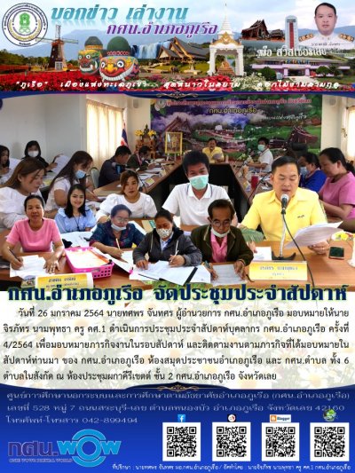 วันที่ 26 มกราคม 2564 นายทศพร จันทศร ผู้อำนวยการ กศน.อำเภอภูเรือ มอบหมายให้นายจิรภัทร นามพุทธา ครู คศ.1 ดำเนินการประชุมประจำสัปดาห์บุคลากร กศน.อำเภอภูเรือ ครั้งที่ 4/2564 เพื่อมอบหมายภารกิจงานในรอบสัปดาห์ และติดตามงานตามภารกิจที่ได้มอบหมายในสัปดาห์ท่านมา ของ กศน.อำเภอภูเรือ ห้องสมุดประชาชนอำเภอภูเรือ และ กศน.ตำบล ทั้ง 6 ตำบลในสังกัด ณ ห้องประชุมผกาคีรีเขตต์ ชั้น 2 กศน.อำเภอภูเรือ จังหวัดเลย