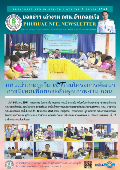 นายทศพร จันทศร ผู้อำนวยการ กศน.อำเภอภูเรือ พร้อมด้วย ข้าราชการครู ครูอาสาสมัครการศึกษานอกโรงเรียน และผู้แทนครู กศน.ตำบล เข้าร่วมโครงการพัฒนาการนิเทศเพื่อยกระดับคุณภาพงาน กศน. สำนักงาน กศน.จังหวัดเลย จัดขึ้นในวันที่ 9 - 10 มีนาคม 2564 โดยมี นายสุพัฒน์