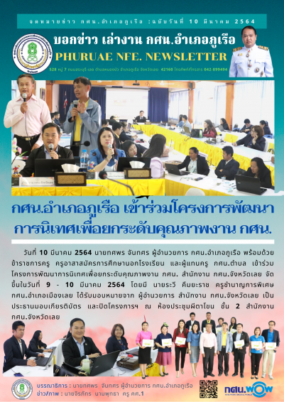 วันที่ 10 มีนาคม 2564 นายทศพร จันทศร ผู้อำนวยการ กศน.อำเภอภูเรือ พร้อมด้วย ข้าราชการครู ครูอาสาสมัครการศึกษานอกโรงเรียน และผู้แทนครู กศน.ตำบล เข้าร่วมโครงการพัฒนาการนิเทศเพื่อยกระดับคุณภาพงาน กศน. สำนักงาน กศน.จังหวัดเลย จัดขึ้นในวันที่ 9 - 10 มีนาคม 2564 โดยมี นายระวี คึมยะราช ครูชำนาญการพิเศษ กศน.อำเภอเมืองเลย ได้รับมอบหมายจาก ผู้อำนวยการ สำนักงาน กศน.จังหวัดเลย เป็นประธานมอบเกียรติบัตร และปิดโครงการฯ ณ ห้องประชุมผีตาโขน ชั้น 2 สำนักงาน กศน.จังหวัดเลย