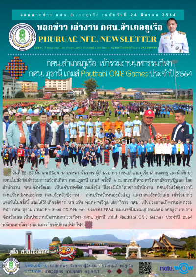 วันที่ 22-23 มีนาคม 2564 นายทศพร จันทศร ผู้อำนวยการ กศน.อำเภอภูเรือ นำคณะครู และนักศึกษา กศน.ในสังกัดเข้าร่วมการแข่งขันกีฬา กศน.ภูธานี เกมส์ ครั้งที่ 6 ณ สนามกีฬามหาวิทยาลัยราชภัฎเลย โดย สำนักงาน กศน.จังหวัดเลย เป็นเจ้าภาพจัดการแข่งขัน ซึ่งจะมีนักกีฬาจากสำนักงาน กศน.จังหวัดอุดรธานี กศน.จังหวัดหนองคาย กศน.จังหวัดบึงกาฬ กศน.จังหวัดหนองบัวลำภู และกศน.จังหวัดเลย เข้าร่วมการแข่งขันในครั้งนี้ และได้รับเกียรติจาก นายวรัท พฤกษาทวีกุล เลขาธิการ กศน. เป็นประธานเปิดงานมหกรรมกีฬา กศน. ภูธานี เกมส์ Phuthani ONIE Games ประจำปี 2564 และนายโสภณ สุวรรณรัตน์ รองผู้ว่าราชการจังหวัดเลย เป็นประธานปิดงานมหกรรมกีฬา กศน. ภูธานี เกมส์ Phuthani ONIE Games ประจำปี 2564 พร้อมมอบโล่รางวัล และเกียรติบัตรแก่นักกีฬา