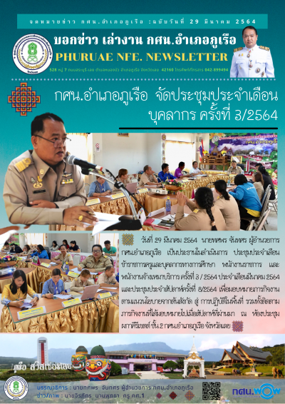 วันที่ 29 มีนาคม 2564 นายทศพร จันทศร ผู้อำนวยการ กศน.อำเภอภูเรือ เป็นประธานในดำเนินการ ประชุมประจำเดือน ข้าราชการครูและบุคลากรทางการศึกษา พนักงานราชการ และพนักงานจ้างเหมาบริการ ครั้งที่ 3 / 2564 ประจำเดือนมีนาคม 2564 และประชุมประจำสัปดาห์ครั้งที่ 8/2564 เพื่อมอบหมายภารกิจงานตามแนวนโยบายจากต้นสังกัด สู่ การปฏิบัติในพื้นที่ รวมทั้งติดตามภารกิจงานที่ได้มอบหมายไปเมื่อสัปดาห์ที่ผ่านมา ณ ห้องประชุมผกาคีรีเขตต์ ชั้น 2 กศน.อำเภอภูเรือ จังหวัดเลย