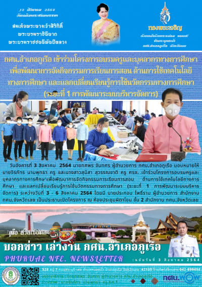 วันอังคารที่ 3 สิงหาคม 2564 นายทศพร จันทศร ผู้อำนวยการ กศน.อำเภอภูเรือ มอบหมายให้ นายจิรภัทร นามพุทธา ครู และนางสาวสุนิสา สุวรรณชาติ ครู ศรช. เข้าร่วมโครงการอบรมครูและบุคลากรทางการศึกษาเพื่อพัฒนาการจัดกิจกรรมการเรียนการสอน ด้านการใช้เทคโนโลยีทางการศึกษา และแลกเปลี่ยนเรียนรู้การใช้นวัตกรรมทางการศึกษา (ระยะที่ 1 การพัฒนาระบบบริหารจัดการ) ระหว่างวันที่ 3 - 6 สิงหาคม 2564 โดยมี นายประกอบ โพธิ์ราม ผู้อำนวยการ สำนักงาน กศน.จังหวัดเลย เป็นประธานเปิดโครงการ ณ ห้องประชุมผีตาโขน ชั้น 2 สำนักงาน กศน.จังหวัดเลย