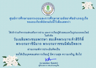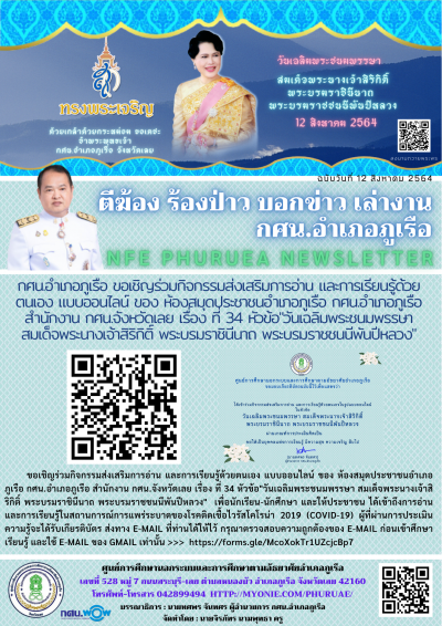 กศน.อำเภอภูเรือ ขอเชิญร่วมกิจกรรมส่งเสริมการอ่าน และการเรียนรู้ด้วยตนเอง แบบออนไลน์ ของ ห้องสมุดประชาชนอำเภอภูเรือ กศน.อำเภอภูเรือ สำนักงาน กศน.จังหวัดเลย เรื่อง ที่ 34 หัวข้อ"วันเฉลิมพระชนมพรรษา สมเด็จพระนางเจ้าสิริกิติ์ พระบรมราชินีนาถ พระบรมราชชนนีพันปีหลวง"