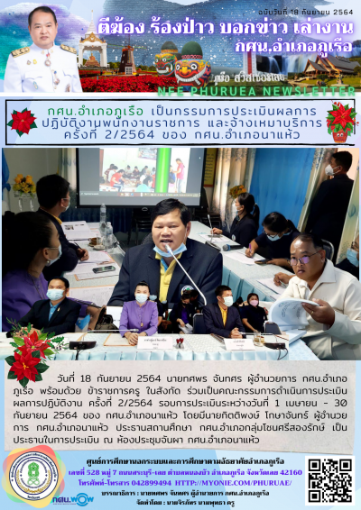 วันที่ 18 กันยายน 2564 นายทศพร จันทศร ผู้อำนวยการ กศน.อำเภอภูเรือ พร้อมด้วย ข้าราชการครู ในสังกัด ร่วมเป็นคณะกรรมการดำเนินการประเมินผลการปฏิบัติงาน ครั้งที่ 2/2564 รอบการประเมินระหว่างวันที่ 1 เมษายน - 30 กันยายน 2564 ของ กศน.อำเภอนาแห้ว โดยมีนายกิตติพงษ์ โกษาจันทร์ ผู้อำนวยการ กศน.อำเภอนาแห้ว ประธานสถานศึกษา กศน.อำเภอกลุ่มโซนศรีสองรักษ์ เป็นประธานในการประเมิน ณ ห้องประชุมจันผา กศน.อำเภอนาแห้ว