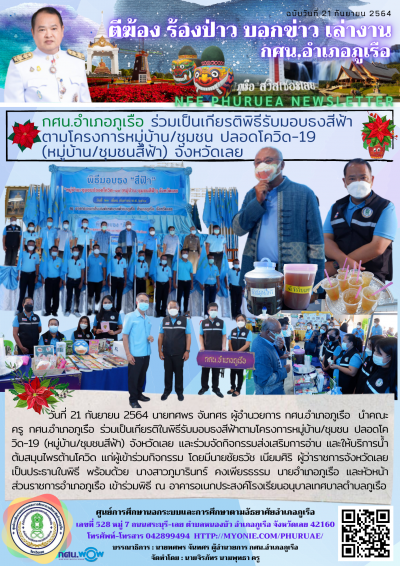 นำคณะครู กศน.อำเภอภูเรือ ร่วมเป็นเกียรติในพิธีรับมอบธงสีฟ้าตามโครงการหมู่บ้าน/ชุมชน ปลอดโควิด-19 (หมู่บ้าน/ชุมชนสีฟ้า) จังหวัดเลย และร่วมจัดกิจกรรมส่งเสริมการอ่าน และให้บริการน้ำต้มสมุนไพรต้านโควิด แก่ผู้เข้าร่วมกิจกรรม โดยมีนายชัยธวัช เนียมศิริ ผู้ว่าราชการจังหวัดเลย เป็นประธานในพิธี พร้อมด้วย นางสาวภูมารินทร์ คงเพียรธรรม นายอำเภอภูเรือ และหัวหน้าส่วนราชการอำเภอภูเรือ เข้าร่วมพิธี ณ อาคารอเนกประสงค์โรงเรียนอนุบาลเทศบาลตำบลภูเรือ