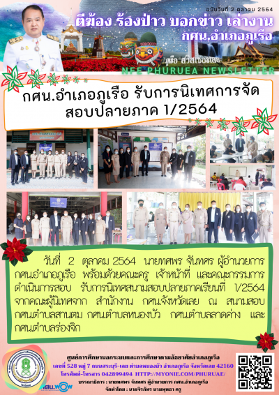 นายทศพร จันทศร ผู้อำนวยการ กศน.อำเภอภูเรือ พร้อมด้วยคณะครู เจ้าหน้าที่ และคณะกรรมการดำเนินการสอบ รับการนิเทศสนามสอบปลายภาคเรียนที่ 1/2564 จากคณะผู้นิเทศจาก สำนักงาน กศน.จังหวัดเลย ณ สนามสอบ กศน.ตำบลสานตม กศน.ตำบลหนองบัว