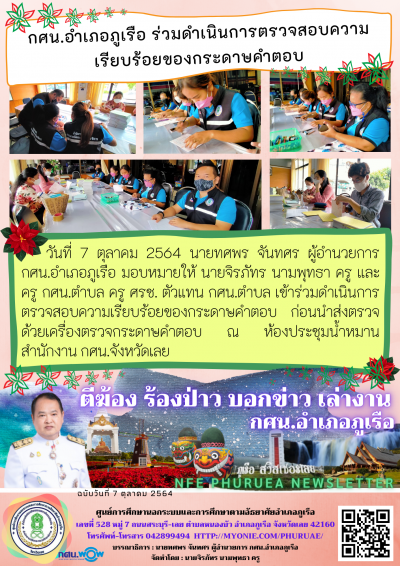 วันที่ 7 ตุลาคม 2564 นายทศพร จันทศร ผู้อำนวยการ กศน.อำเภอภูเรือ มอบหมายให้ นายจิรภัทร นามพุทธา ครู และครู กศน.ตำบล ครู ศรช. ตัวแทน กศน.ตำบล เข้าร่วมดำเนินการตรวจสอบความเรียบร้อยของกระดาษคำตอบ ก่อนนำส่งตรวจด้วยเครื่องตรวจกระดาษคำตอบ ณ ห้องประชุมน้ำหมาน สำนักงาน กศน.จังหวัดเลย