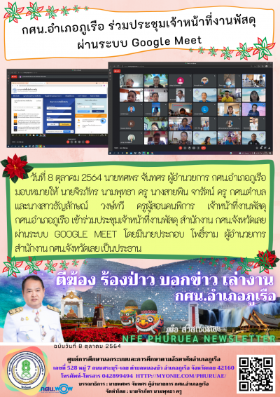 วันที่ 8 ตุลาคม 2564 นายทศพร จันทศร ผู้อำนวยการ กศน.อำเภอภูเรือ มอบหมายให้ นายจิรภัทร นามพุทธา ครู นางสายพิน จารัตน์ ครู กศน.ตำบล และนางสาวธัญลักษณ์ วงษ์ทวี ครูผู้สอนคนพิการ เจ้าหน้าที่งานพัสดุ กศน.อำเภอภูเรือ เข้าร่วมประชุมเจ้าหน้าที่งานพัสดุ สำนักงาน กศน.จังหวัดเลย ผ่านระบบ Google Meet โดยมีนายประกอบ โพธิ์ราม ผู้อำนวยการสำนักงาน กศน.จังหวัดเลย เป็นประธาน