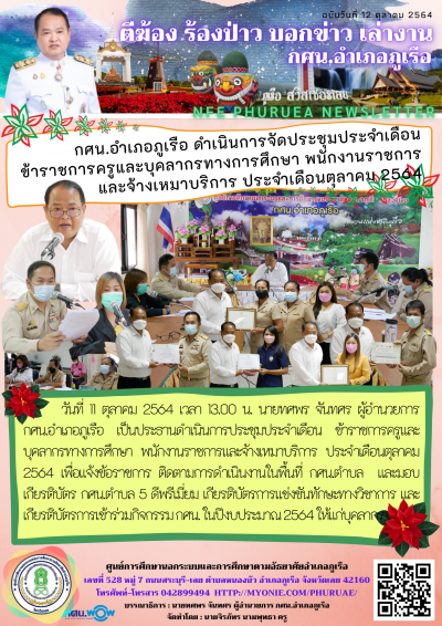 วันที่ 11 ตุลาคม 2564 เวลา 13.00 น. นายทศพร จันทศร ผู้อำนวยการ กศน.อำเภอภูเรือ เป็นประธานดำเนินการประชุมประจำเดือน ข้าราชการครูและบุคลากรทางการศึกษา พนักงานราชการและจ้างเหมาบริการ ประจำเดือนตุลาคม 2564 เพื่อแจ้งข้อราชการ ติดตามการดำเนินงานในพื้นที่ กศน.ตำบล