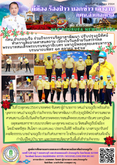 วันที่ 13 ตุลาคม 2564 นายทศพร จันทศร ผู้อำนวยการ กศน.อำเภอภูเรือ พร้อมด้วยบุคลากร กศน.อำเภอภูเรือ ร่วมกิจกรรม จิตอาสาพัฒนา ปรับปรุงภูมิทัศน์ ทำความสะอาดศาสนสถาน เนื่องในวันคล้ายวันสวรรคตพระบาทสมเด็จพระบรมชนกาธิเบศร มหาภูมิพลอดุลยเดชมหาราช บรมนาถบพิตร ๑๓ ตุลาคม ๒๕๖๔ ณ วัดสมเด็จภูเรือมิ่งเมืองโดยมี พลตรีสุระ สินโสภา ผบ.มทบ.๒๘ ประธานในพิธี พร้อมด้วย นางสาวภูมารินทร์คงเพียรธรรม นายอำเภอภูเรือ ร่วมกับส่วนราชการ โรงเรียน องค์กรปกครองส่วนท้องถิ่น กำนัน ผู้ใหญ่บ้าน ฯลฯ และประชาชนจิตอาสาในพื้นที่ เข้าร่วมกิจกรรม