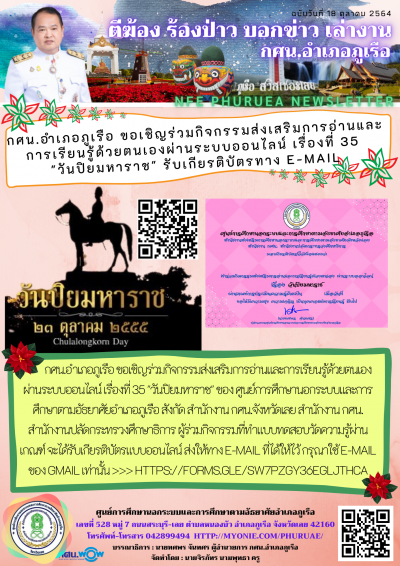 กศน.อำเภอภูเรือ ขอเชิญร่วมกิจกรรมส่งเสริมการอ่านและการเรียนรู้ด้วยตนเองผ่านระบบออนไลน์ เรื่องที่ 35 "วันปิยมหาราช" รับเกียรติบัตรทาง E-MAIL