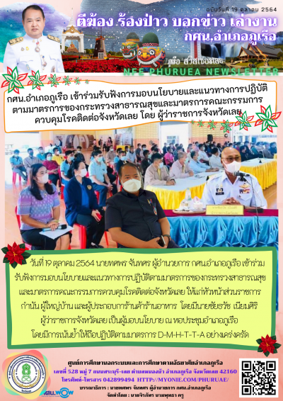 วันที่ 19 ตุลาคม 2564 นายทศพร จันทศร ผู้อำนวยการ กศน.อำเภอภูเรือ เข้าร่วมรับฟังการมอบนโยบายและแนวทางการปฏิบัติตามมาตรการของกระทรวงสาธารณสุขและมาตรการคณะกรรมการควบคุมโรคติดต่อจังหวัดเลย ให้แก่หัวหน้าส่วนราชการ กำนัน ผู้ใหญ่บ้าน และผู้ประกอบการ้านค้าร้านอาหาร โดยมีนายชัยธวัช เนียมศิริ ผู้ว่าราชการจังหวัดเลย เป็นผู้มอบนโยบาย ณ หอประชุมอำเภอภูเรือ โดยมีการเน้นย้ำให้ถือปฏิบัติตามมาตรการ D-M-H-T-T-A อย่างเคร่งครัด