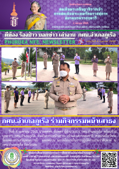 วันที่ 4 เมษายน 2565 นายทศพร จันทศร ผู้อำนวยการ กศน.อำเภอภูเรือ พร้อมด้วยบุคลากร กศน.อำเภอภูเรือ ร่วมกิจกรรมหน้าเสาธง เข้าแถวเคารพธงชาติ สวดมนต์ไหว้พระ ร้องเพลงสรรเสริญพระบารมี และพบปะ มอบนโยบายในการปฏิบัติงานประจำสัปดาห์ ณ กศน.อำเภอภูเรือ จังหวัดเลย