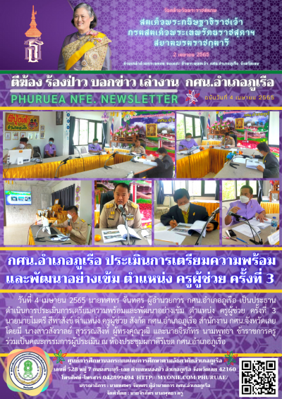 วันที่ 4 เมษายน 2565 นายทศพร จันทศร ผู้อำนวยการ กศน.อำเภอภูเรือ เป็นประธานดำเนินการประเมินการเตรียมความพร้อมและพัฒนาอย่างเข้ม ตำแหน่ง ครูผู้ช่วย ครั้งที่ 3 นายนายไมตรี สีทาสังข์ ตำแหน่ง ครูผู้ช่วย สังกัด กศน.อำเภอภูเรือ สำนักงาน กศน.จังหวัดเลย โดยมี นางสาวสังวาลย์ สุวรรณสิงห์ ผู้ทรงคุณวุฒิ และนายจิรภัทร นามพุทธา ข้าราชการครู ร่วมเป็นคณะกรรมการผู้ประเมิน ณ ห้องประชุมผกาคีรีเขต กศน.อำเภอภูเรือ
