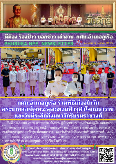 วันที่ 6 เมษายน 2565 นายทศพร จันทศร ผู้อำนวยการ กศน.อำเภอภูเรือ มอบหมายให้ นายจิรภัทร นามพุทธา ครู คศ.1 นำคณะบุคลากรในสังกัด ร่วมพิธีเนื่องในวันพระบาทสมเด็จพระพุทธยอดฟ้าจุฬาโลกมหาราช และวันที่ระลึกถึงมหาจักรีบรมราชวงศ์ โดยมี นางนันท์นภัส บุญยะประทีป ปลัดอำเภอ เจ้าพนักงานปกครองชำนาญการพิเศษ เป็นประธานในพิธี ณ หอประชุมอำเภอภูเรือ จังหวัดเลย