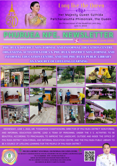 วันพุธที่ 1 มิถุนายน 2565 นายทศพร จันทศร ผู้อำนวยการ กศน.อำเภอภูเรือ นำคณะบุคลากรในสังกัด ทำกิจกรรม 5 ส. กศน.งามตาม ประชาชื่นใจ พัฒนาปรับปรุงภูมิทัศน์ ภายนอกและภายใน ที่ทำการ กศน.อำเภอภูเรือ และห้องสมุดประชาชนอำเภอภูเรือ ให้เป็นแหล่งเรียนรู้ตลอดชีวิตของประชาชนชาวอำเภอภูเรือ