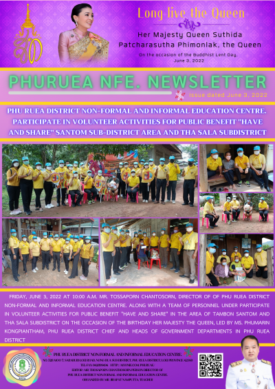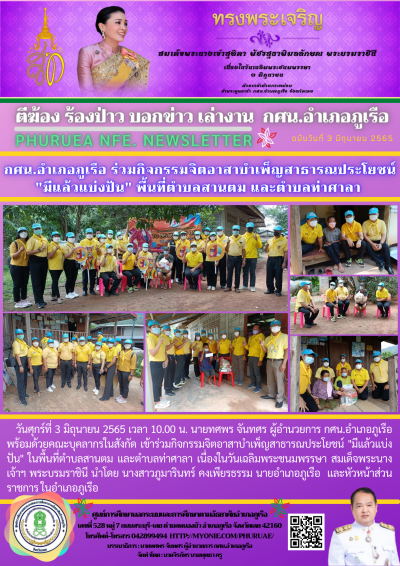 วันศุกร์ที่ 3 มิถุนายน 2565 เวลา 10.00 น. นายทศพร จันทศร ผู้อำนวยการ กศน.อำเภอภูเรือ พร้อมด้วยคณะบุคลากรในสังกัด เข้าร่วมกิจกรรมจิตอาสาบำเพ็ญสาธารณประโยชน์ "มีแล้วแบ่งปัน" ในพื้นที่ตำบลสานตม และตำบลท่าศาลา เนื่องในวันเฉลิมพระชนมพรรษา สมเด็จพระนางเจ้าฯ พระบรมราชินี นำโดย นางสาวภูมารินทร์ คงเพียรธรรม นายอำเภอภูเรือ