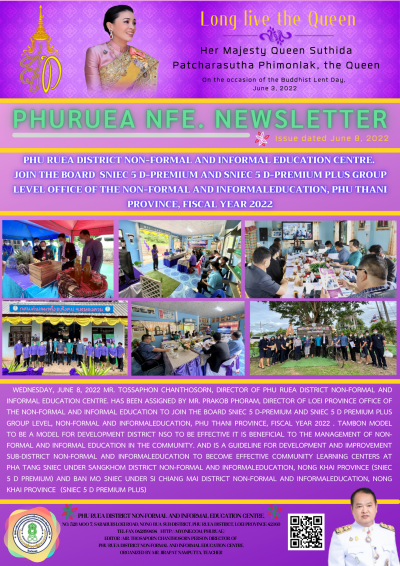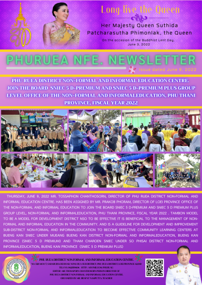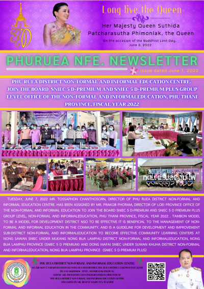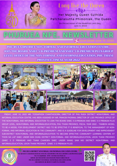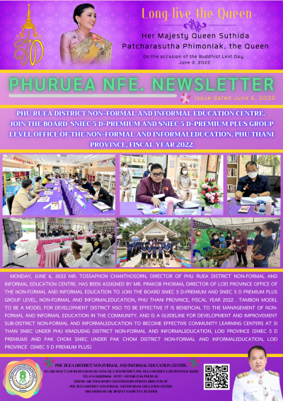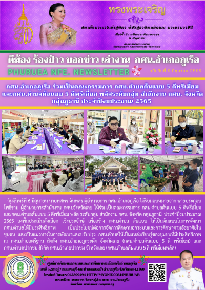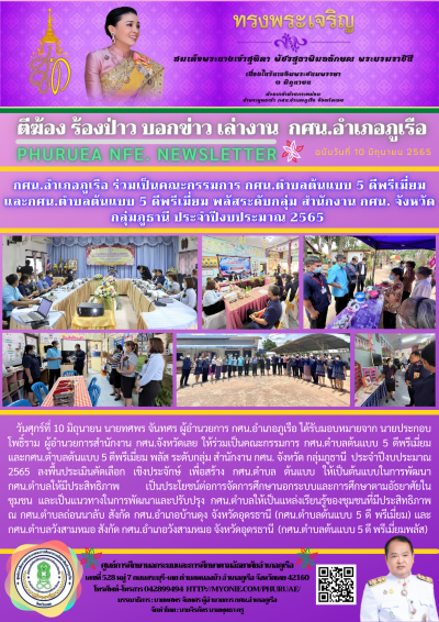 วันที่ 6-10 มิถุนายน นายทศพร จันทศร ผู้อำนวยการ กศน.อำเภอภูเรือ ได้รับมอบหมายจาก นายประกอบ โพธิ์ราม ผู้อำนวยการสำนักงาน กศน.จังหวัดเลย ให้ร่วมเป็นคณะกรรมการ กศน.ตำบลต้นแบบ 5 ดีพรีเมี่ยม และกศน.ตำบลต้นแบบ 5 ดีพรีเมี่ยม พลัส ระดับกลุ่ม สำนักงาน กศน. จังหวัด กลุ่มภูธานี