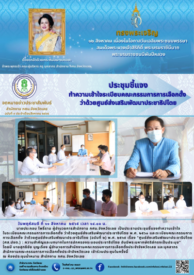 วันพฤหัสบดี ที่ ๑๑ สิงหาคม ๒๕๖๕ เวลา ๑๔.๐๐ น.นายประกอบ โพธิ์ราม ผู้อำนวยการสำนักงาน กศน.จังหวัดเลย เป็นประธานประชุมชี้แจงทำความเข้าใจ ในระเบียบคณะกรรมการการเลือกตั้ง ว่าด้วยศูนย์ส่งเสริมพัฒนาประชาธิปไตย พ.ศ. ๒๕๖๐ และระเบียบคณะกรรมการ การเลือกตั้ง ว่าด้วยศูนย์ส่งเสริมพัฒนาประชาธิปไตย (ฉบับที่ ๒) พ.ศ. ๒๕๖๕ เรื่อง "ศูนย์ส่งเสริมพัฒนาประชาธิปไตย (ศส.ปชต.) : ความสำคัญและบทบาทในการปกครองระบอบประชาธิปไตย อันมีพระมหากษัตริย์ทรงเป็นประมุข"โดยมี นายสุทธิชัย บุญเรือง ผู้อำนวยการสำนักงานคณะกรรมการการเลือกตั้งประจำจังหวัดเลย และบุคลากร สำนักงานคณะกรรมการการเลือกตั้งประจำจังหวัดเลย เข้าร่วมประชุมในครั้งนี้ ณ ห้องประชุมน้ำหมาน สำนักงาน กศน.จังหวัดเลย