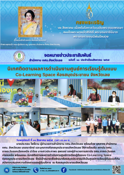 วันพฤหัสบดี ที่ ๑๑ สิงหาคม ๒๕๖๕ เวลา ๑๖.๐๐ น. นายประกอบ โพธิ์ราม ผู้อำนวยการสำนักงาน กศน.จังหวัดเลย พร้อมด้วย บุคลากร สำนักงาน กศน. จังหวัดเลย บรรณารักษ์ และบุคลากรห้องสมุดประชาชนจังหวัดเลย ให้การต้อนรับ สถาบัน กศน. ภาคตะวันออกเฉียงเหนือ นำโดย นางสาวประภาพร สุพรรณ์ รองผู้อำนวยการสถาบัน กศน.ภาคตะวันออกเฉียงเหนือ พร้อมคณะ นิเทศติดตามผลการดำเนินงานศูนย์การเรียนรู้ต้นแบบ Co-Learning Spaceห้องสมุดประชาชนจังหวัดเลย ซึ่งมีเป้าหมายเพื่อพัฒนาห้องสมุดประชาชนให้เป็นศูนย์การเรียนรู้ต้นแบบที่ทันสมัยตอบสนองความต้องการของผู้รับบริการ ณ ห้องสมุดประชาชนจังหวัดเลย