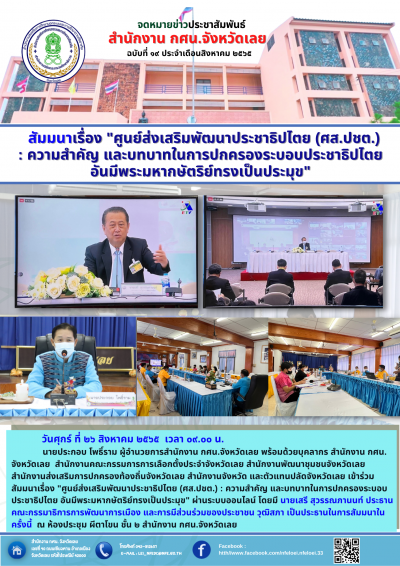 วันศุกร์ ที่ ๒๖ สิงหาคม ๒๕๖๕ เวลา ๐๙.๐๐ น. นายประกอบ โพธิ์ราม ผู้อำนวยการสำนักงาน กศน.จังหวัดเลย พร้อมด้วยบุคลากร สำนักงาน กศน. จังหวัดเลย สำนักงานคณะกรรมการการเลือกตั้งประจำจังหวัดเลย สำนักงานพัฒนาชุมชนจังหวัดเลย สำนักงานส่งเสริมการปกครองท้องถิ่นจังหวัดเลย สำนักงานจังหวัด และตัวแทนปลัดจังหวัดเลย เข้าร่วมสัมมนาเรื่อง "ศูนย์ส่งเสริมพัฒนาประชาธิปไตย (ศส.ปชต.) : ความสำคัญ และบทบาทในการปกครองระบอบประชาธิปไตย อันมีพระมหากษัตริย์ทรงเป็นประมุข" ผ่านระบบออนไลน์ โดยมี นายเสรี สุวรรณภานนท์ ประธานคณะกรรมาธิการการพัฒนาการเมือง และการมีส่วนร่วมของประชาชน วุฒิสภา เป็นประธานในการสัมมนาในครั้งนี้ ณ ห้องประชุม ผีตาโขน ชั้น ๒ สำนักงาน กศน.จังหวัดเลย
