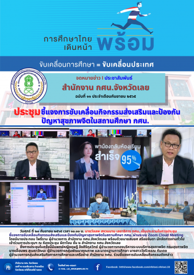 วันศุกร์ ที่ ๒๓ กันยายน ๒๕๖๕ เวลา ๑๐.๐๐ น. นายวัลลพ สงวนนาม เลขาธิการ กศน. เป็นประธานในการประชุมชี้แจงการขับเคลื่อนกิจกรรมส่งเสริมและป้องกันปัญหาสุขภาพจิตในสถานศึกษา กศน. ผ่านระบบ Zoom Cloud Meeting โดยมีนายประกอบ โพธิ์ราม ผู้อำนวยการ สำนักงาน กศน.จังหวัดเลย พร้อมด้วยนายสมยศ สร้อยจันดา นักจัดการงานทั่วไปเข้าร่วมการประชุมฯ ณ ห้องประชุม ผีตาโขน ชั้น ๒ สำนักงาน กศน.จังหวัดเลย