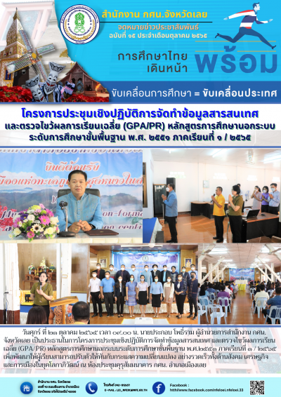 วันศุกร์ ที่ ๒๑ ตุลาคม ๒๕๖๕ เวลา ๐๙.๐๐ น. นายประกอบ โพธิ์ราม ผู้อำนวยการสำนักงาน กศน. จังหวัดเลย เป็นประธานในการโครงการประชุมเชิงปฏิบัติการจัดทำข้อมูลสารสนเทศ และตรวจไขว้ผลการเรียนเฉลี่ย (GPA/PR) หลักสูตรการศึกษานอกระบบระดับการศึกษาขั้นพื้นฐาน พ.ศ.๒๕๕๑ ภาคเรียนที่ ๑ / ๒๕๖๕ เพื่อพัฒนาให้ผู้เรียนสามารถปรับตัวให้ทันกับกระแสความเปลี่ยนแปลง อย่างรวดเร็วทั้งด้านสังคม เศรษฐกิจและการเมืองในยุคโลกาภิวัฒน์ ณ ห้องประชุมคุรุสัมมนาคาร กศน. อำเภอเมืองเลย