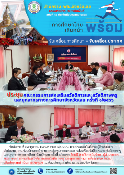 วันอังคาร ที่ ๒๕ ตุลาคม ๒๕๖๕ เวลา ๐๙.๐๐ น. นายประกอบ โพธิ์ราม ผู้อำนวยการ สำนักงาน กศน.จังหวัดเลย เข้าร่วมการประชุมคณะกรรมการส่งเสริมสวัสดิการและสวัสดิภาพครูและบุคลากรทางการศึกษาจังหวัดเลย ครั้งที่ ๑/๒๕๖๖ โดยมี นายวิเศษ อิ่มรักษา ผู้อำนวยการคณะกรรมการส่งเสริมสวัสดิการและสวัสดิภาพครู และบุคลากรทางการศึกษาจังหวัดเลยเป็นประธานดำเนินการประชุมฯ ณ ห้องประชุมสำนักงาน สกสค.จังหวัดเลย