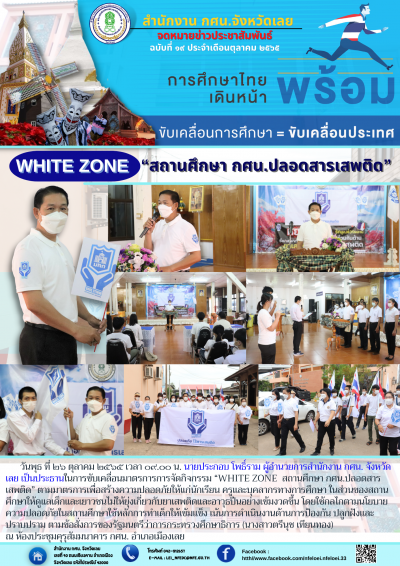 วันพุธ ที่ ๒๖ ตุลาคม ๒๕๖๕ เวลา ๐๙.๐๐ น. นายประกอบ โพธิ์ราม ผู้อำนวยการสำนักงาน กศน. จังหวัดเลย เป็นประธานในการขับเคลื่อนมาตรการการจัดกิจกรรม “WHITE ZONE สถานศึกษา กศน.ปลอดสารเสพติด” ตามมาตรการเพื่อสร้างความปลอดภัยให้แก่นักเรียน ครูและบุคลากรทางการศึกษา ในส่วนของสถานศึกษาให้ดูแลเด็กและเยาวชนไม่ให้ยุ่งเกี่ยวกับยาเสพติดและอาวุธปืนอย่างเข้มงวดขึ้น โดยใช้กลไกตามนโยบายความปลอดภัยในสถานศึกษาใช้หลักการทำเด็กให้เข้มแข็ง เน้นการดำเนินงานด้านการป้องกัน ปลูกฝังและปราบปราม ตามข้อสั่งการของรัฐมนตรีว่าการกระทรวงศึกษาธิการ (นางสาวตรีนุช เทียนทอง)ณ ห้องประชุมคุรุสัมมนาคาร กศน. อำเภอเมืองเลย