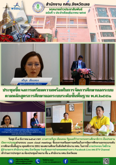 วันพุธ ที่ ๗ ธันวาคม ๒๕๖๕ เวลา นางสาวตรีนุช เทียนทอง รัฐมนตรีว่าการกระทรวงศึกษาธิการ เป็นประธาน เปิดการประชุมผ่านระบบ zoom cloud meetings ชี้แจงการเตรียมความพร้อมในการจัดการศึกษานอกระบบระดับการศึกษาขั้นพื้นฐาน พุทธศักราช 2551 ของสถานศึกษาในสังกัดสำนักงาน กศน. ในการนี้ นายประกอบ โพธิ์ราม ผู้อำนวยการ สำนักงาน กศน.จังหวัดเลย ร่วมรับชมการถ่ายทอดสดผ่านทาง Facebook Live เพจ ETV Channel เข้าร่วมการประชุมฯ ณ ห้องประชุมน้ำหมาน ชั้น ๑ สำนักงาน กศน.จังหวัดเลย