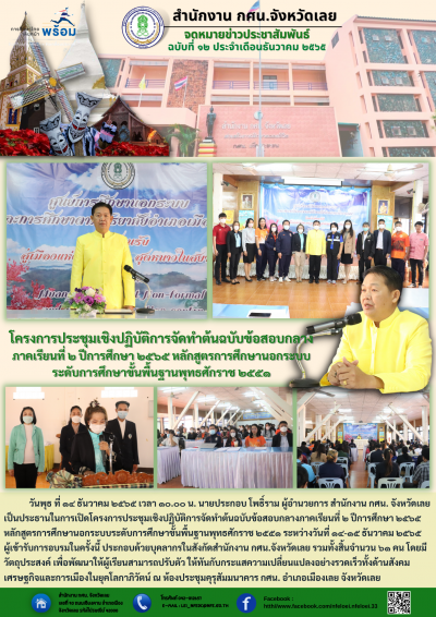 วันพุธ ที่ ๑๔ ธันวาคม ๒๕๖๕ เวลา ๑๐.๐๐ น. นายประกอบ โพธิ์ราม ผู้อำนวยการ สำนักงาน กศน. จังหวัดเลย เป็นประธานในการเปิดโครงการประชุมเชิงปฏิบัติการจัดทำต้นฉบับข้อสอบกลางภาคเรียนที่ ๒ ปีการศึกษา ๒๕๖๕ หลักสูตรการศึกษานอกระบบระดับการศึกษาขั้นพื้นฐานพุทธศักราช ๒๕๕๑ ระหว่างวันที่ ๑๔-๑๕ ธันวาคม ๒๕๖๕ ผู้เข้ารับการอบรมในครั้งนี้ ประกอบด้วยบุคลากรในสังกัดสำนักงาน กศน.จังหวัดเลย รวมทั้งสิ้นจำนวน ๖๑ คน โดยมีวัตถุประสงค์ เพื่อพัฒนาให้ผู้เรียนสามารถปรับตัว ให้ทันกับกระแสความเปลี่ยนแปลงอย่างรวดเร็วทั้งด้านสังคม เศรษฐกิจและการเมืองในยุคโลกาภิวัตน์ ณ ห้องประชุมคุรุสัมมนาคาร กศน. อำเภอเมืองเลย จังหวัดเลย