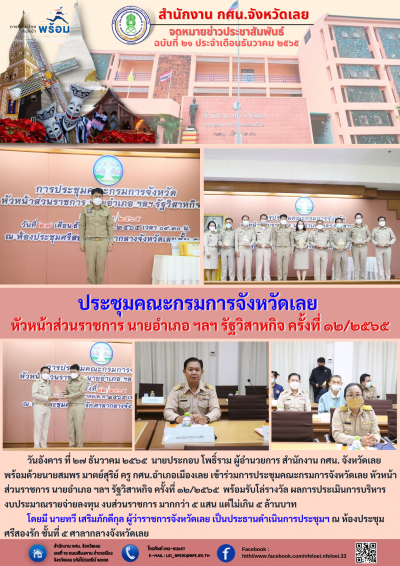 วันอังคาร ที่ ๒๗ ธันวาคม ๒๕๖๕ นายประกอบ โพธิ์ราม ผู้อำนวยการ สำนักงาน กศน. จังหวัดเลย พร้อมด้วยนายสมพร มาตย์สุริย์ ครู กศน.อำเภอเมืองเลย เข้าร่วมการประชุมคณะกรมการจังหวัดเลย หัวหน้าส่วนราชการ นายอำเภอ ฯลฯ รัฐวิสาหกิจ ครั้งที่ ๑๒/๒๕๖๕ พร้อมรับโล่รางวัล ผลการประเมินการบริหารงบประมาณรายจ่ายลงทุน งบส่วนราชการ มากกว่า ๕ แสน แต่ไม่เกิน ๕ ล้านบาท โดยมี นายทวี เสริมภักดีกุล ผู้ว่าราชการจังหวัดเลย เป็นประธานดำเนินการประชุมฯ ณ ห้องประชุมศรีสองรัก ชั้นที่ ๕ ศาลากลางจังหวัดเลย