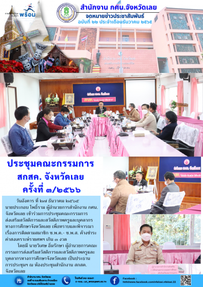 วันอังคาร ที่ ๒๗ ธันวาคม ๒๕๖๕ นายประกอบ โพธิ์ราม ผู้อำนวยการสำนักงาน กศน. จังหวัดเลย เข้าร่วมการประชุมคณะกรรมการส่งเสริมสวัสดิการและสวัสดิภาพครูและบุคลากรทางการศึกษาจังหวัดเลย เพื่อทราบและพิจารณาเรื่องการติดตามสมาชิก ช.พ.ค.- ช.พ.ส. ค้างชำระค่าสงเคราะห์รายศพฯ เกิน ๓ งวด โดยมี นายวิเศษ อิ่มรักษา ผู้อำนวยการคณะกรรมการส่งเสริมสวัสดิการและสวัสดิภาพครูและบุคลากรทางการศึกษาจังหวัดเลย เป็นประธานการประชุมฯ ณ ห้องประชุมสำนักงาน สกสค.จังหวัดเลย