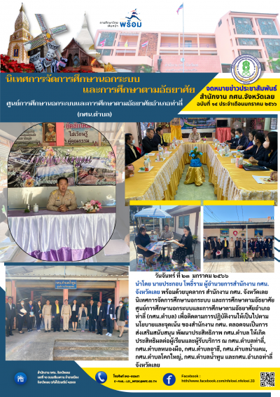 วันจันทร์ ที่ ๒๓ มกราคม ๒๕๖๖ นำโดย นายประกอบ โพธิ์ราม ผู้อำนวยการสำนักงาน กศน. จังหวัดเลย พร้อมด้วยบุคลากร สำนักงาน กศน. จังหวัดเลย นิเทศการจัดการศึกษานอกระบบ และการศึกษาตามอัธยาศัย ศูนย์การศึกษานอกระบบและการศึกษาตามอัธยาศัยอำเภอท่าลี่ (กศน.ตำบล) เพื่อติดตามการปฏิบัติงานให้เป็นไปตามนโยบายและจุดเน้น ของสำนักงาน กศน. ตลอดจนเป็นการ ส่งเสริมสนับสนุน พัฒนาประสิทธิภาพ กศน.ตำบล ให้เกิดประสิทธิผลต่อผู้เรียนและผู้รับบริการ ณ กศน.ตำบลท่าลี่, กศน.ตำบลหนองผือ, กศน.ตำบลอาฮี, กศน.ตำบลน้ำแคม, กศน.ตำบลโคกใหญ่, กศน.ตำบลน้ำทูน และกศน.อำเภอท่าลี่ จังหวัดเลย