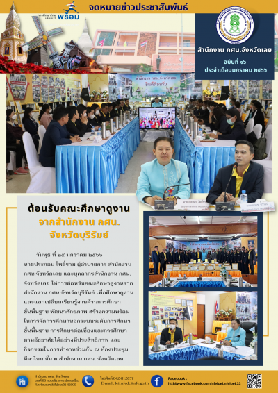 วันพุธ ที่ ๒๕ มกราคม ๒๕๖๖ นายประกอบ โพธิ์ราม ผู้อำนวยการ สำนักงาน กศน.จังหวัดเลย และบุคลากรสำนักงาน กศน. จังหวัดเลย ให้การต้อนรับคณะศึกษาดูงานจากสำนักงาน กศน.จังหวัดบุรีรัมย์ เพื่อศึกษาดูงานและแลกเปลี่ยนเรียนรู้งานด้านการศึกษาขั้นพื้นฐาน พัฒนาศักยภาพ สร้างความพร้อม ในการจัดการศึกษานอกระบบระดับการศึกษาขั้นพื้นฐาน การศึกษาต่อเนื่องและการศึกษาตามอัธยาศัยได้อย่างมีประสิทธิภาพ และกิจกรรมในการทำงานร่วมกัน ณ ห้องประชุม ผีตาโขน ชั้น ๒ สำนักงาน กศน. จังหวัดเลย