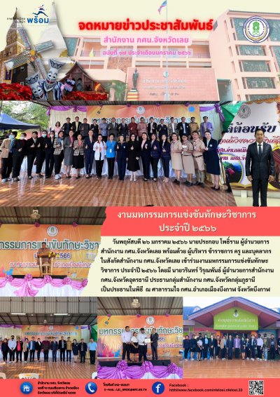 วันพฤหัสบดี ๒๖ มกราคม ๒๕๖๖ นายประกอบ โพธิ์ราม ผู้อำนวยการสำนักงาน กศน.จังหวัดเลย พร้อมด้วย ผู้บริหาร ข้าราชการ ครู และบุคลากร ในสังกัดสำนักงาน กศน.จังหวัดเลย เข้าร่วมงานมหกรรมการแข่งขันทักษะวิชาการ ประจำปี ๒๕๖๖ โดยมี นายวรินทร์ วิรุณพันธ์ ผู้อำนวยการสำนักงาน กศน.จังหวัดอุดรธานี ประธานกลุ่มสำนักงาน กศน.จังหวัดกลุ่มภูธานี เป็นประธานในพิธี ณ ศาลารวมใจ กศน.อำเภอเมืองบึงกาฬ จังหวัดบึงกาฬ