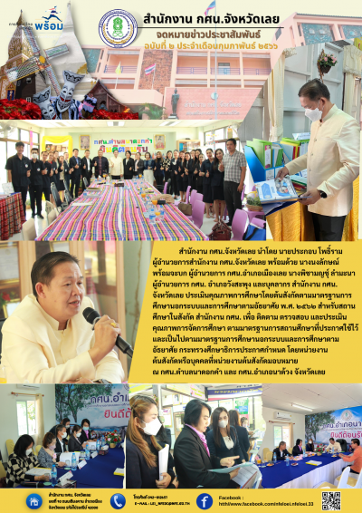 สำนักงาน กศน.จังหวัดเลย นำโดย นายประกอบ โพธิ์ราม ผู้อำนวยการสำนักงาน กศน.จังหวัดเลย พร้อมด้วย นางนงลักษณ์ พร้อมจะบก ผู้อำนวยการ กศน.อำเภอเมืองเลย นางพิชามญชุ์ ลำมะนา ผู้อำนวยการ กศน. อำเภอวังสะพุง และบุคลากร สำนักงาน กศน. จังหวัดเลย ประเมินคุณภาพการศึกษาโดยต้นสังกัดตามมาตรฐานการศึกษานอกระบบและการศึกษาตามอัธยาศัย พ.ศ. ๒๕๖๒ สำหรับสถานศึกษาในสังกัด สำนักงาน กศน. เพื่อ ติดตาม ตรวจสอบ และประเมินคุณภาพการจัดการศึกษา ตามมาตรฐานการสถานศึกษาที่ประกาศใช้ไว้และเป็นไปตามมาตรฐานการศึกษานอกระบบและการศึกษาตามอัธยาศัย กระทรวงศึกษาธิการประกาศกำหนด โดยหน่วยงาน ต้นสังกัดหรือบุคคลที่หน่วยงานต้นสังกัดมอบหมาย ณ กศน.ตำบลนาดอกคำ และ กศน.อำเภอนาด้วง จังหวัดเลย